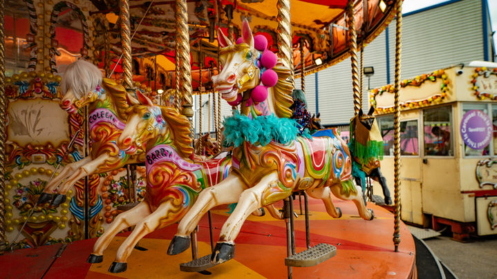 Guests arrived through a dual-sensory tunnel, choosing between an analogue glow archway or a digital brilliance path alive with a bespoke soundscape. The journey opened onto a Miami-inspired beach complete with a bespoke lifeguard tower, a vintage carousel with costumed horses and an 80s jet ski photo moment - a playful blend of retro glamour and festival fantasy.